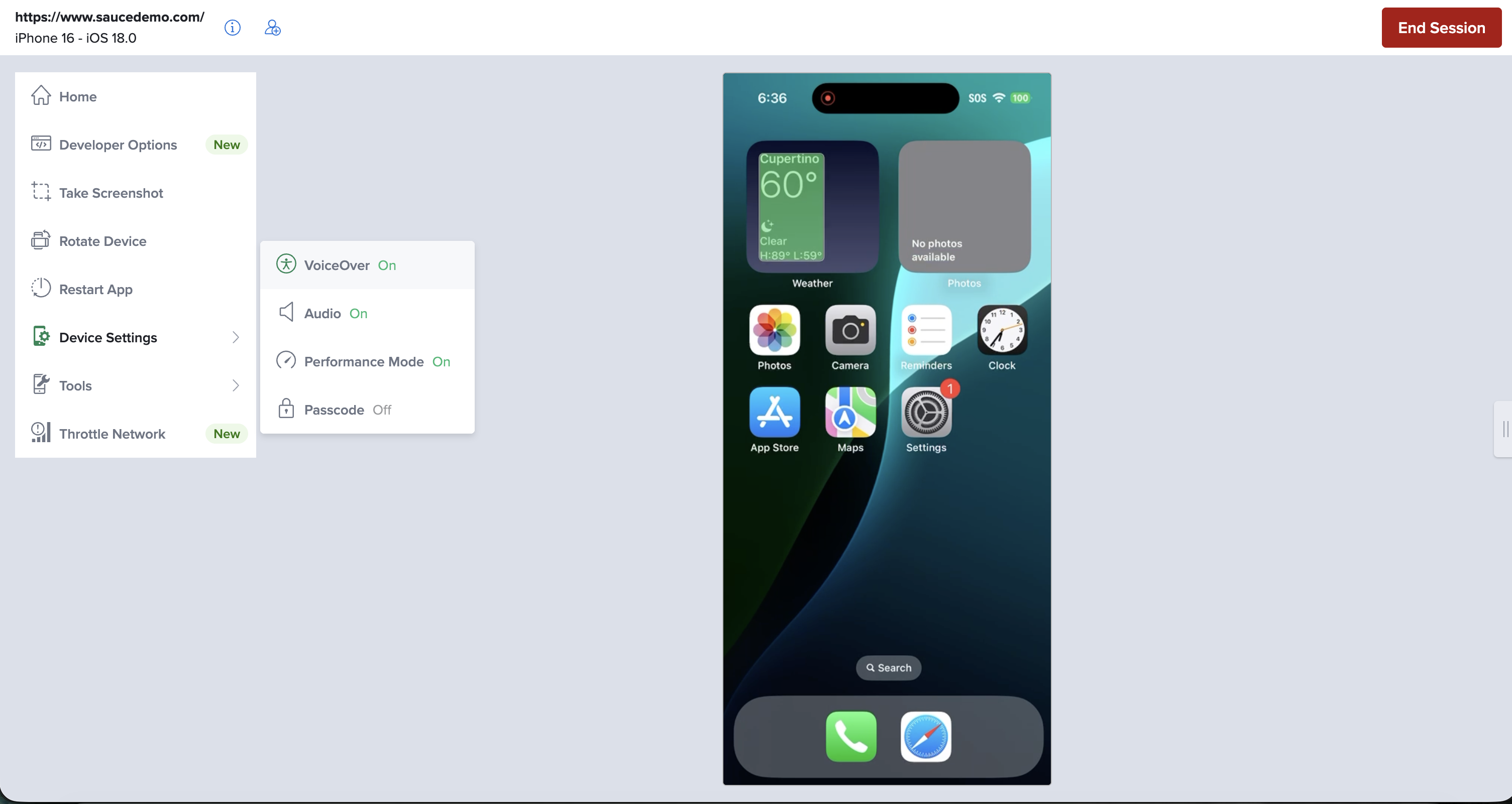 • An iOS real device session (Live Testing).